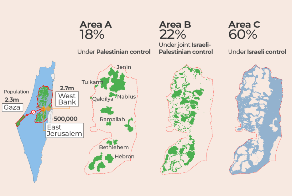 Filistin Kurtuluş Organizasyonu (FKO) lideri Yâsir Arafat ile İsrail Başvekîli Yitzhak Rabin arasında 1993 ve 1995 yıllarında gerçekleşen Oslo Görüşmeleri neticesinde Batı Şeria ile Gazze topraklarında bir Filistin İdâresi (Palestinian Authority, PA) kurulmuştu. Gazze’nin 2007’de Hamas kontrölüne girmesiyle beraber, Filistin İdâresi, Batı Şeria ile sınırlanmış oldu. Aslında Batı Şeria’nın küçük bir bölümü demek daha doğru olur, çünkü Oslo Görüşmeleri Batı Şeria’yı “geçici olarak” üç mıntıkaya ayırmıştı: