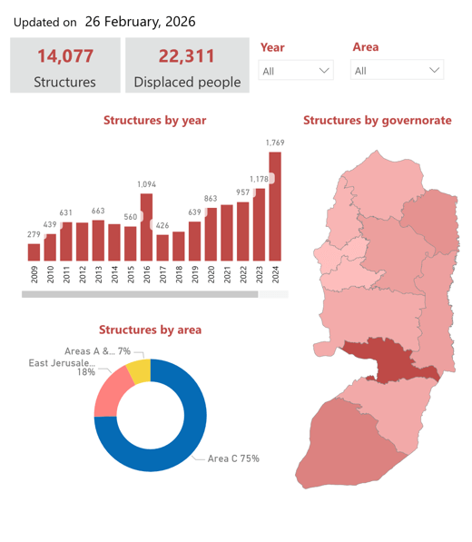 Birleşmiş Milletler İnsânî Yardım Koordinasyon Ofisi’ne (UNOCHA) göre, İsrail Batı Şeria’da 2009’dan bu yana Filistinlilere âit en az 14.000 binayı yıktı. Yıkılan binaların sayısında 2023’ten bu yana ciddi bir artış görülüyor.