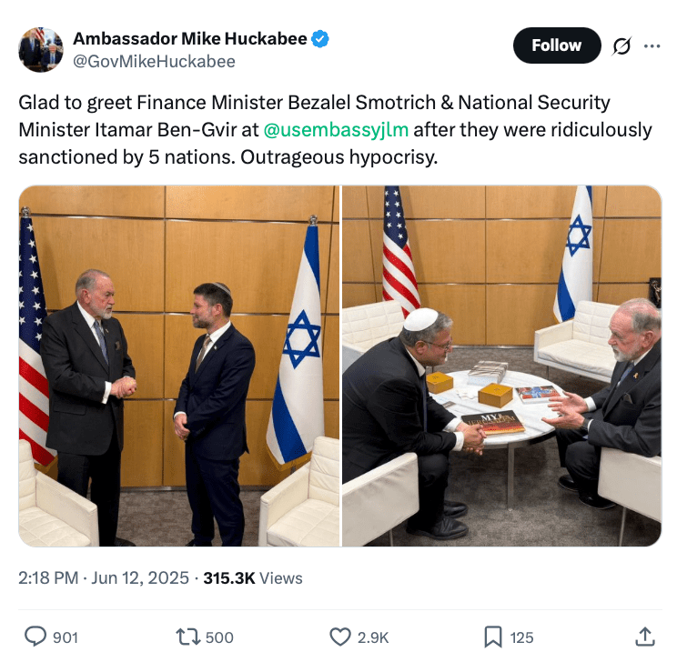 Mike Huckabee’nin büyükelçilikte ağırladığı yegâne ihtilaflı misafir Jonathan Pollard değildi. Netanyahu’nun yakın dostu ve destekçisi olan Huckabee, onun koalisyon ortakları olan aşırı sağcı bakanlar Itamar Ben-Gvir ile Bezalel Smotrich’i de elçilikte konuk etmişti.